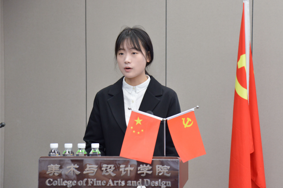 在奏唱国歌后,由美术与设计学院的优秀学员代表谢宛含进行发言,分享了此次党员骨干培训班的感想感悟。她表示,身为党员骨干的我们在砥砺奋进的同时,更应当勤于反省自身、互相监督,保持积极昂扬的心态。在支部生活与工作中,守初心,养恒心、淬匠心,以最美“三心”,传承实干精神;以坚定的决心、信心和恒心,走好“必由之路”;以强大的志气、骨气、底气,用好“有利条件”。