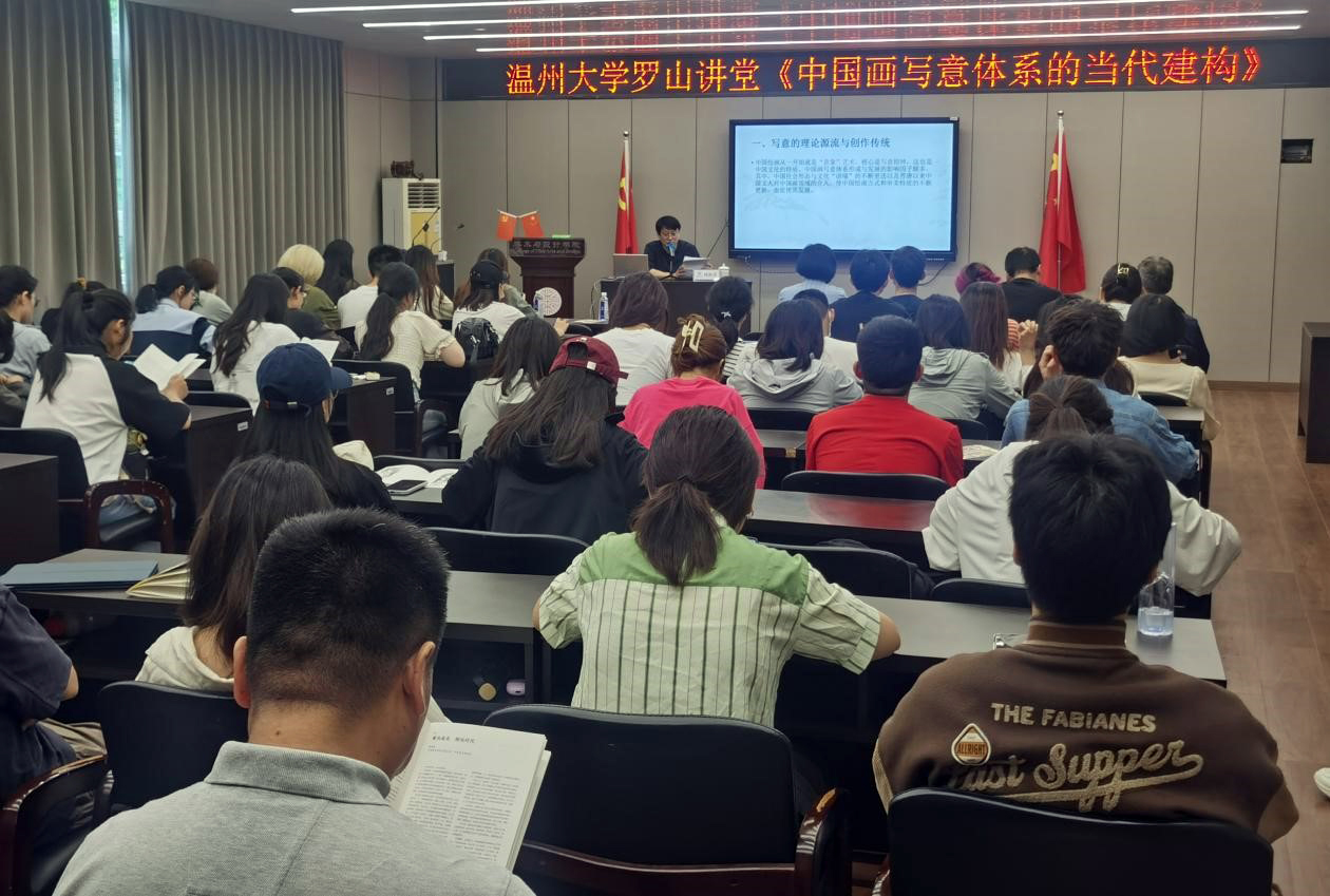 作为“天下有风:刘海勇中国画作品展”社会美育活动的重要组成部分,2023年6月4日,中国美术学院博士生导师刘海勇教授莅临我校“罗山讲堂”,带来《中国画写意体系的当代建构》的学术讲座。本次活动由温州大学和中国美术学院主办,我院和中国美术学院中国画学研究所承办,我院教师、本硕学生、校外嘉宾等80余人参加,讲座由学院院长谢子静教授主持。 谢子静院长对刘海勇教授的莅临表示热烈欢迎,并介绍了刘教授的艺术简历和学术成果。刘海勇教授是乐清人,1990年以来先后就读于乐清师范学校、温州师范学院(现温州大学)、中国美术学院和中央美术学院,是我国中国画领域第一位教育部青年长江学者,现任中国美术学院科研创作处处长、中国美术家协会中国画艺委会委员、西泠印社社员、中国画学会会员、浙江省美术家协会理事兼副秘书长、浙江省美术名家孵化工作小组成员、中国美术学院中国画学研究所常务副所长。 作为我院优秀校友,刘海勇教授在讲座伊始深情回顾了在温州大学求学时的难忘时光。随后他从“写意理论源流与创作传统”方面阐说中国画的特质。梳理了中国画写意研究的历史脉络,强调哲学精神与中国画家思维方式的统一性,探讨中国画写意体系在当代面临的关键问题,构建凸显中国特色的写意现代学理性体系。接着刘教授从“‘两端三位一体’中国画人才培养模式研究”谈学院学科专业建设之路,并指出高校中国画人才培养模式的问题,提出了解决方案。最后他从“中国画写意体系的精神根源”,详述写意审美的范畴、传承的轨迹、理法的价值、实践的发展。刘海勇教授对比中西艺术表现形式的差异性,例举了潘天寿、齐白石、吴昌硕等画家的名作进行讲解,他表示,在当下跨文化语境中,更应该注重绘画的民族精神,实现文化的传承与创新。 讲座结束后,刘海勇教授就写意体系内容与参会者进行了深入交流,并鼓励学生们坚持中国绘画精神,砥砺艺术品格,在今后的学习中,建立艺术自觉、自信与自豪。