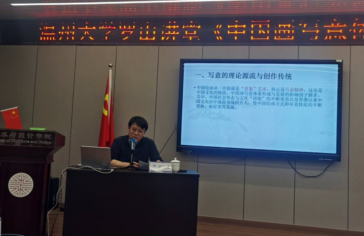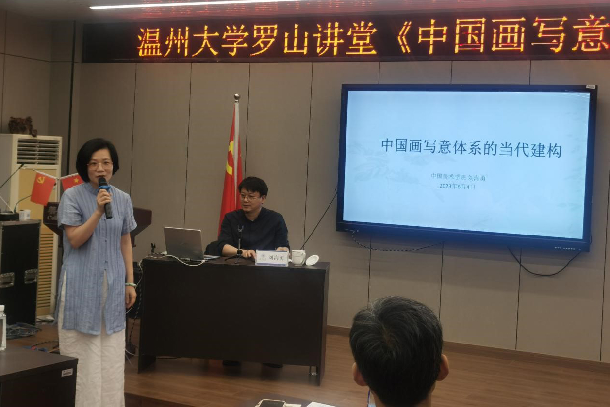 作为“天下有风:刘海勇中国画作品展”社会美育活动的重要组成部分,2023年6月4日,中国美术学院博士生导师刘海勇教授莅临我校“罗山讲堂”,带来《中国画写意体系的当代建构》的学术讲座。本次活动由温州大学和中国美术学院主办,我院和中国美术学院中国画学研究所承办,我院教师、本硕学生、校外嘉宾等80余人参加,讲座由学院院长谢子静教授主持。