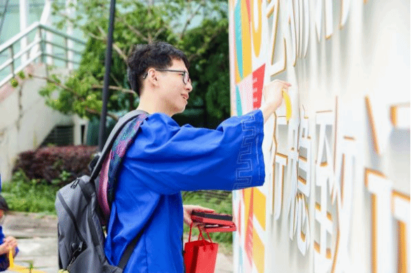 廉韵入画,景绘廉风。美术学院秉持“融廉于景”的创意理念,将廉洁文化巧妙地融入毕业典礼的各个环节。在庄重的会场前,一幅用毕业生名字组合的“艺扬清风 行稳致远”喷绘墙格外引人注目,不少毕业生纷纷驻足拍照,留下难忘的毕业记忆。这幅喷绘墙不仅是一道美丽的风景线,更是学院对毕业生们廉洁从业、行稳致远的殷殷期望。
