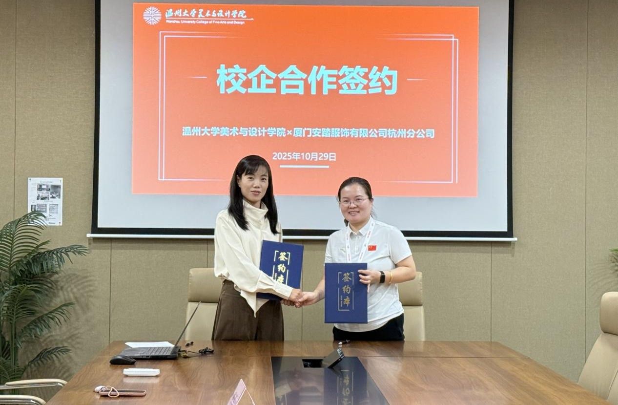 2025 年 10 月 29 日下午,温州大学美术与设计学院与厦门安踏服饰有限公司杭州分公司校企实习(实践)基地合作签约仪式,在温州大学科创大楼 303 会议室举行。此次签约标志着双方在产教融合、人才培养领域的深度合作正式拉开帷幕。 仪式伊始,温州大学美术与设计学院就业辅导员范佩宏介绍了双方出席仪式的嘉宾,并围绕服装设计专业毕业生实习就业、企业实践资源优势等方面,介绍了本次校企合作的背景与初衷。温州大学美术与设计学院副院长胡文超致辞。他介绍了学院专业设置、学科建设、人才培养模式、毕业生就业质量等方面的情况。他并表示,安踏作为国内体育服饰领域的领军企业,在设计研发、品牌运营等方面拥有丰富经验,此次合作将为学院服装设计专业学生搭建 “课堂 + 实践” 的优质平台,助力学生将理论知识转化为职业能力,同时也为学院人才培养模式创新提供有力支撑。 随后,厦门安踏服饰有限公司浙江分公司人事总监杨菊艳女士发言,她指出,温州大学美术与设计学院在服装设计领域拥有深厚的教学底蕴和优秀的人才储备,此次校企实习基地的建立,将实现企业人才需求与高校人才培养的精准对接,为安踏注入新鲜血液,也为学生提供宝贵的实践机会。 仪式环节,温州大学美术与设计学院服装设计教研室主任陈莹与厦门安踏服饰有限公司浙江分公司人事总监杨菊艳作为双方代表,共同签署了校企实习(实践)基地合作协议。 未来,双方将围绕实习实训、课程共建、项目合作等方面展开深度协作,携手培养适应行业发展需求的高素质服装设计人才,为推动服装产业高质量发展贡献力量。初审:谢巍复审:范佩宏终审:叶如芳