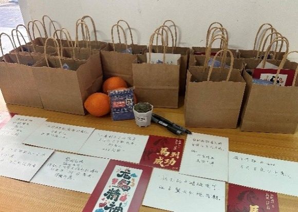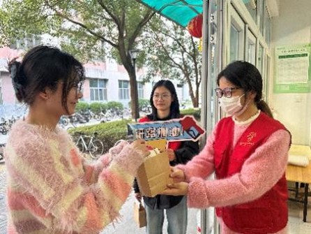 毕业生公寓楼下,身着红马甲的志愿者们早已就位,将一份份寓意深远的礼物细心分装、摆放得井井有条。贺卡藏着手写的祝愿,是“落笔有回响”的美好期许;分装袋收纳着点滴心意,寓意整理思绪、从容应考;金黄的橙子,谐音“成”功,寄托着心想事成、硕果累累的美好祝愿;小巧的多肉盆栽,象征着考研路上的耐力与执着;简约的台历,静静伫立,提醒着时光有序,步履不停。