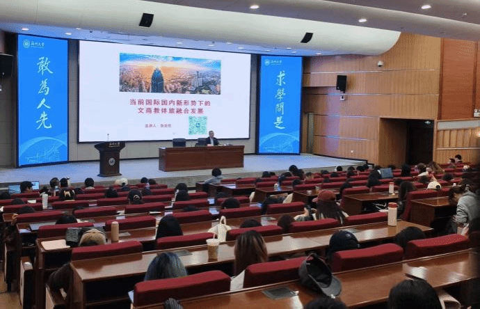 为深入贯彻落实国家文商教体旅融合发展战略,精准对接地方文旅产业发展需求,拓宽学院师生学术视野。4月1日下午,学院在图书馆举办《当前国际国内新形势下的文商教体旅融合发展》专题讲座。本次讲座特邀温州市文化广电旅游局二级巡视员张志宏担任主讲人,学院领导、专业教师及各年级学生到场聆听学习。讲座伊始,张志宏巡视员围绕“国际国内新形势”这一核心开篇,立足全球发展大局与国家战略布局,深入剖析了当前中美关系、中日关系、台海局势及香港问题等热点国际国内议题,帮助师生明晰宏观发展环境、拓宽视野。随后,他系统阐释了经济建设、科技创新与文化传承融合发展的内在逻辑,解读宏观变革对高校学科建设、人才培养的深远影响,为学院服务区域发展提供理论指引。结合美术与设计学院的专业特色,张志宏巡视员将理论与实践紧密结合,以浙BA文旅融合项目、“六个温州”文旅品牌打造等典型案例为切入点,深入分析了文商教体旅融合发展的新趋势、新路径,为学院专业建设、师生职业发展提供了方向指引。互动交流环节,现场师生热情高涨,围绕“设计与乡村振兴的结合路径”“AI技术在文旅发展中的应用前景”“艺术生就业创业的新赛道与新机遇”等议题踊跃提问,与张志宏巡视员展开深入交流。张志宏巡视员耐心细致解答,与大家展开了深入的交流与探讨。此次专题讲座,不仅拓宽了师生的学术视野,强化了师生与地方文旅产业融合发展的意识,助力师生职业生涯发展,更为学院未来的发展提供了宝贵的思路和建议。下一步,学院将以此次讲座为契机,紧扣温州区域发展需求,深化产教融合、校地合作,立足专业特色,推动艺术设计成果转化,将文商教体旅融合理念融入学科建设、人才培养全过程,努力培养更多适应新时代需求、能够服务地方文旅高质量发展的应用型艺术人才,为温州文旅品牌建设注入新的活力。初审:谢巍 复审范佩宏,终审:谢子静