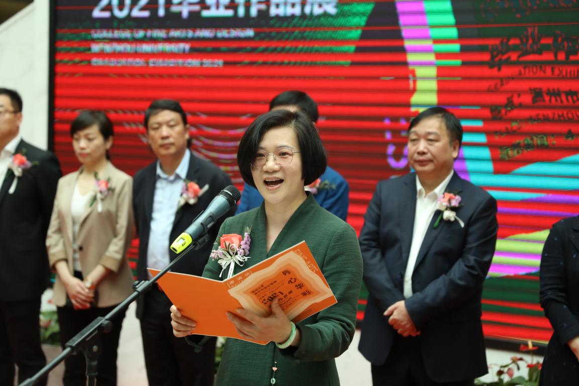 4月28日上午,温州大学美术与设计学院2021届毕业作品展在温州市文化馆隆重开幕。 温州大学校长赵敏,温州市委宣传部副部长叶艳,温州市文化广电旅游局党组成员、调研员纪建军,温州市文联党组成员、副主席谢子康,中国美术家协会理事、浙江省美术家协会副主席、温州市美术家协会主席张成毕,温州市经济和信息化局生产服务业处处长侯旭丹,温州市文化广电旅游局艺术处处长林佩,温州市文化馆副馆长陈泳,温州大学美术与设计学院校友会会长汤可术,温州大学教务处副处长赵燕,以及温州大学美术与设计学院院长谢子静,党委书记叶正飞,党委副书记杨丽君,副院长顾任飞,温州大学美术与设计学院校友会副会长、秘书长金纬等领导与嘉宾亲临现场。 参加开幕式的还有兄弟院校代表以及媒体记者、学校师生等共300余人,美术与设计学院副院长胡文超主持开幕式。 首先,温州市文联副主席谢子康致辞。谢子康向本届毕业展的隆重举行表示祝贺。他充分肯定了我校在培养艺术人才、创作精品力作、为温州地方文化艺术事业的兴旺与发展方面作出的积极贡献,并对未来美术与设计学院继续推动温州地方文化建设,繁荣市民文化生活,服务地方文化产业发展寄予厚望。 随后,美术与设计学院院长谢子静致辞。谢子静向与会领导和嘉宾表示欢迎,向全体指导师和毕业生们表示感谢和祝贺。她指出,本届作品展以“丹心华彩”为主题,参与展示的作品或传承经典,或具象写实,或抽象空灵,无论是绘画还是设计,都展现出对生活的细心观察和无限热爱,对艺术的独特理解和完美诠释,赋予每一幅作品不同的灵魂。同时,她对毕业生提出希望和要求,希望他们不要忘记学校里美好的青春时光,不忘母校情,同时要求他们铭记温州大学“求学问是、敢为人先”的校训,始终坚持为理想信念努力拼搏。 接着,毕业生代表朱晗瑞同学发言,她代表全体毕业生向母校、师长、家人、朋友以及指导师致以感激与敬意。她表示,毕业生们将努力把个人理想融入国家富强、民族复兴、人民幸福的伟大梦想之中,用青春书写使命担当。 最后,由温州大学校长赵敏先生宣布展览开幕! 展览来自美术学、视觉传达设计、环境设计、服装与服饰设计等5个专业232位毕业生的400多件设计作品和创意项目,总结和展示了毕业生四年来阶段性的学习成果,也标志着他们牢记时代赋予的重任踏入社会的崭新开端。 本次静态展由温州市委宣传部、温州市文化广电旅游局、温州市文学艺术界联合会、温州大学主办,温州大学美术与设计学院承办。展览将持续至5月6日,期间免费向市民开放。