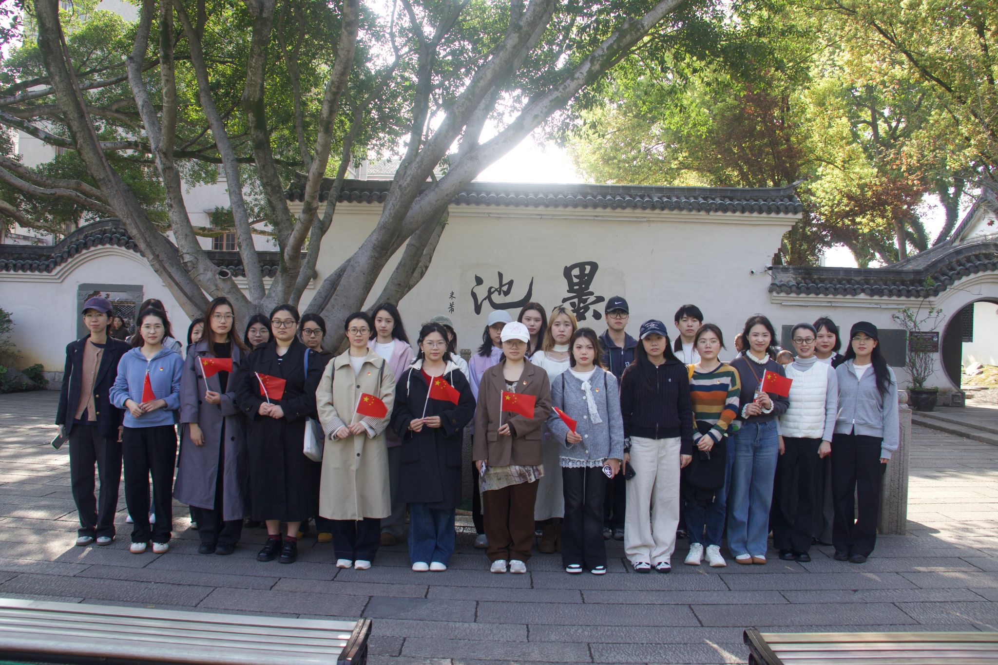 随后,师生党员前往墨池公园探寻千年文脉。墨池公园是温州古城文化地标,因东晋王羲之任永嘉郡守时 “临池作书、洗砚于此” 得名,宋代米芾曾题字留念,是历代文人墨客的艺术圣地。园内古木葱茏、池水澄澈,墨池遗址、古坊建筑与园林景致相融,尽显瓯越文化儒雅底蕴。