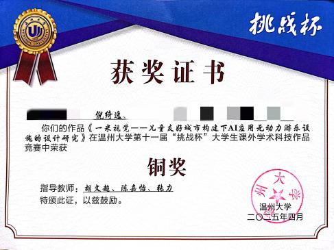 通过参与各类竞赛与实践,我对科研精神有了更为具体的理解。从为自闭症关怀创作海报,到获得院级职业生涯规划大赛一等奖;从与团队在“挑战杯”中携手并肩、荣获铜奖,到共同打磨、申报外观设计专利……我不断尝试将专业知识与公益项目、社会议题相结合,让科研连接公益关切、回应社会议题、激发创新设计。