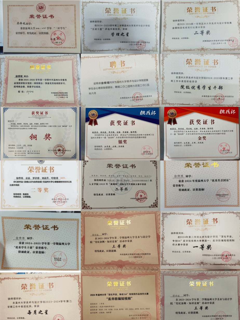 出色的管理能力,离不开扎实的专业素养与综合技能。徐烨垠精通办公软件,擅长撰写推文、制作海报与视频,绘画功底扎实且沟通能力突出更是为她的管理工作增添助力。在各类竞赛与评选中,她获得了优异的成绩,这些成绩既是对她个人能力的肯定,也成为她做好管理工作的底气。