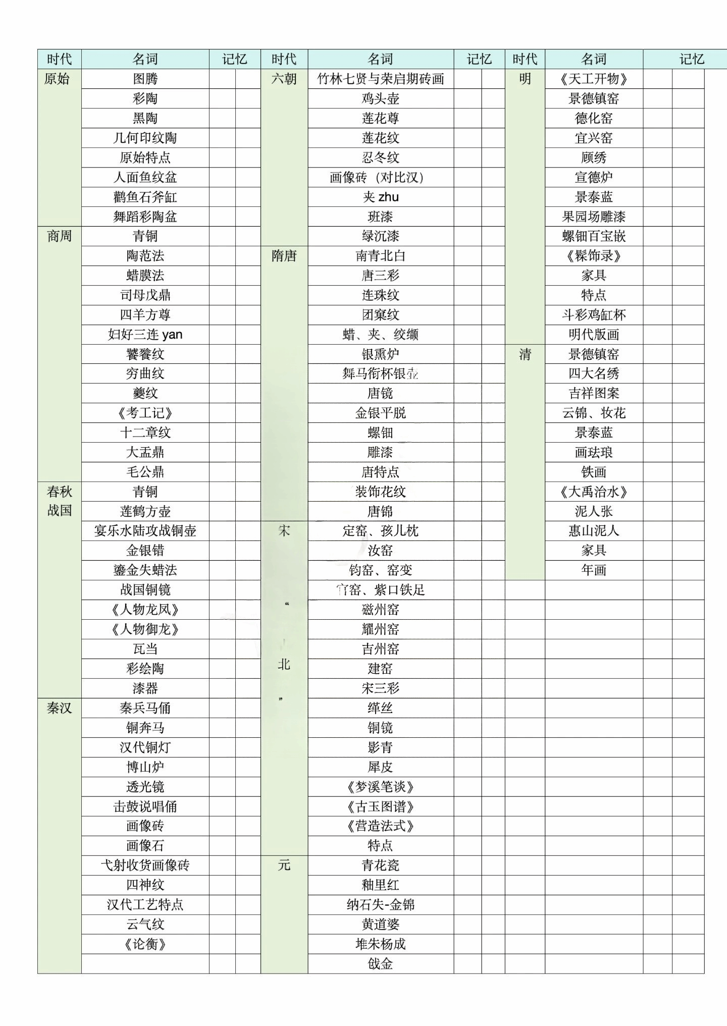 8月份第一次接触两本书我先跟着机构的课程快速过了一遍知识点,搭建了两本书的知识框架。接着九月就开始背诵:第一遍背完一本大概用了十五天,两本都背完一轮后,每本再重复背,一遍背一边手写出简略重点,在背诵过程中,我并非死记硬背,而是结合理解背诵。对于一些重要的历史事件、设计理念和代表作品,我会先去深入了解其背后的文化背景、创作动机以及影响,这样在记忆的时候就更加深刻,也更容易在脑海中形成一个完整的知识体系,中后期背诵时,我打印了一张概括所有章节知识点的表格,每次按顺序背诵,再复盘总结,让我能不断强化记忆。另外,我还会定期做一些模拟题和真题,通过做题来检验自己的背诵效果,发现自己薄弱的地方,然后有针对性地进行强化复习。
