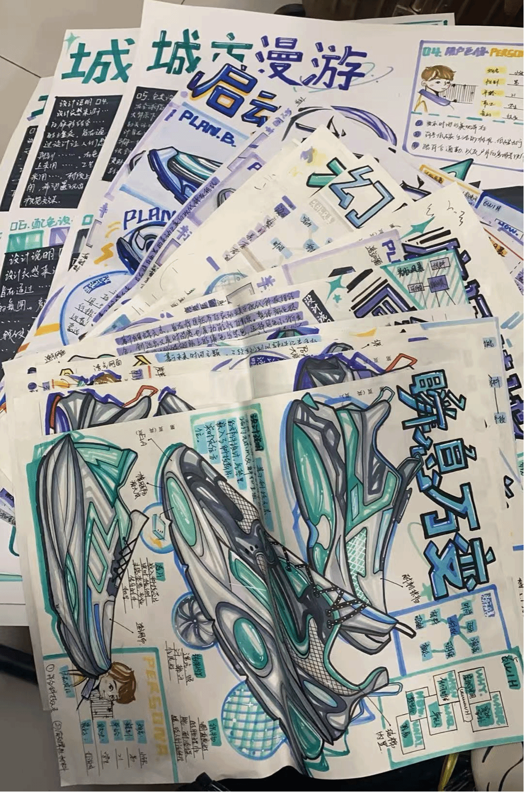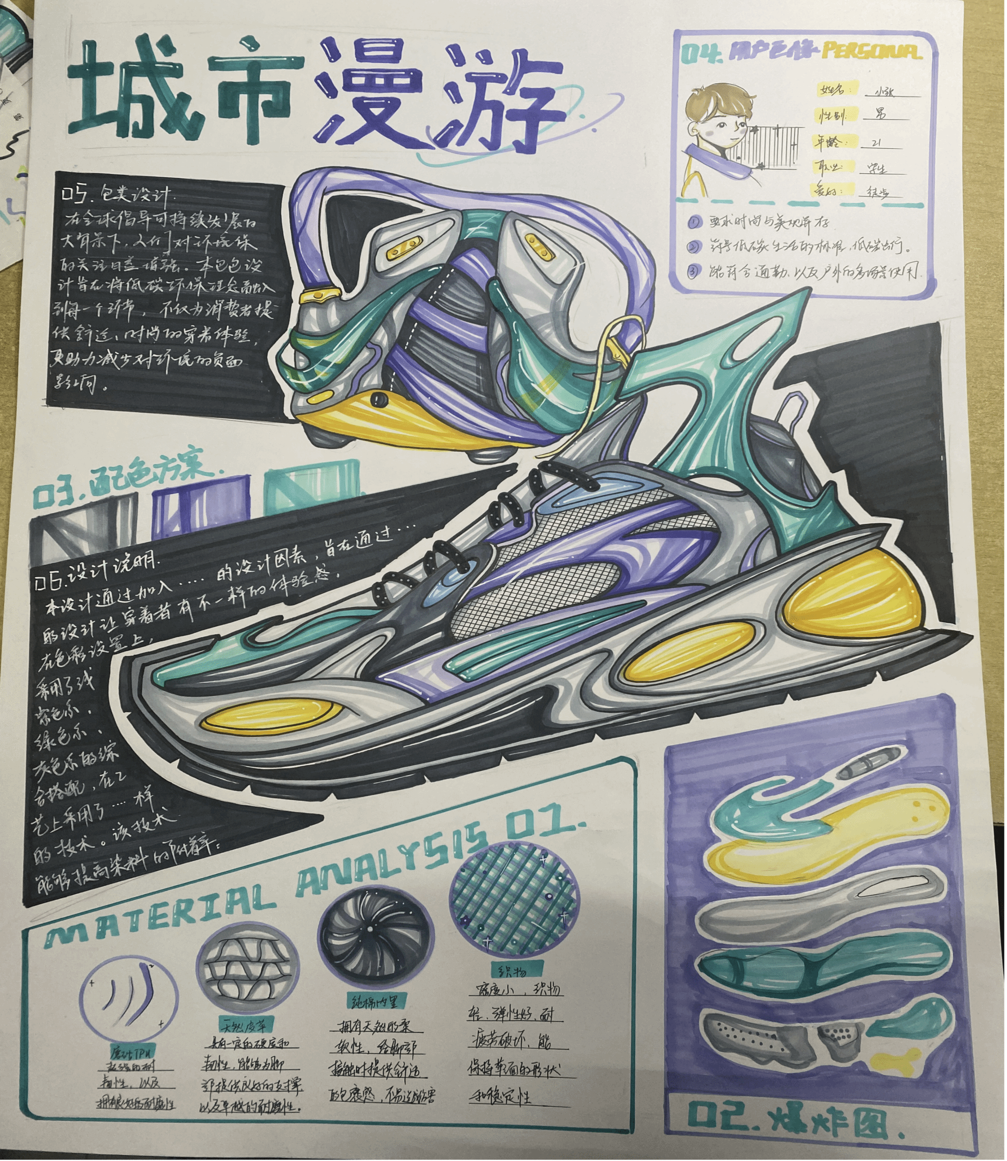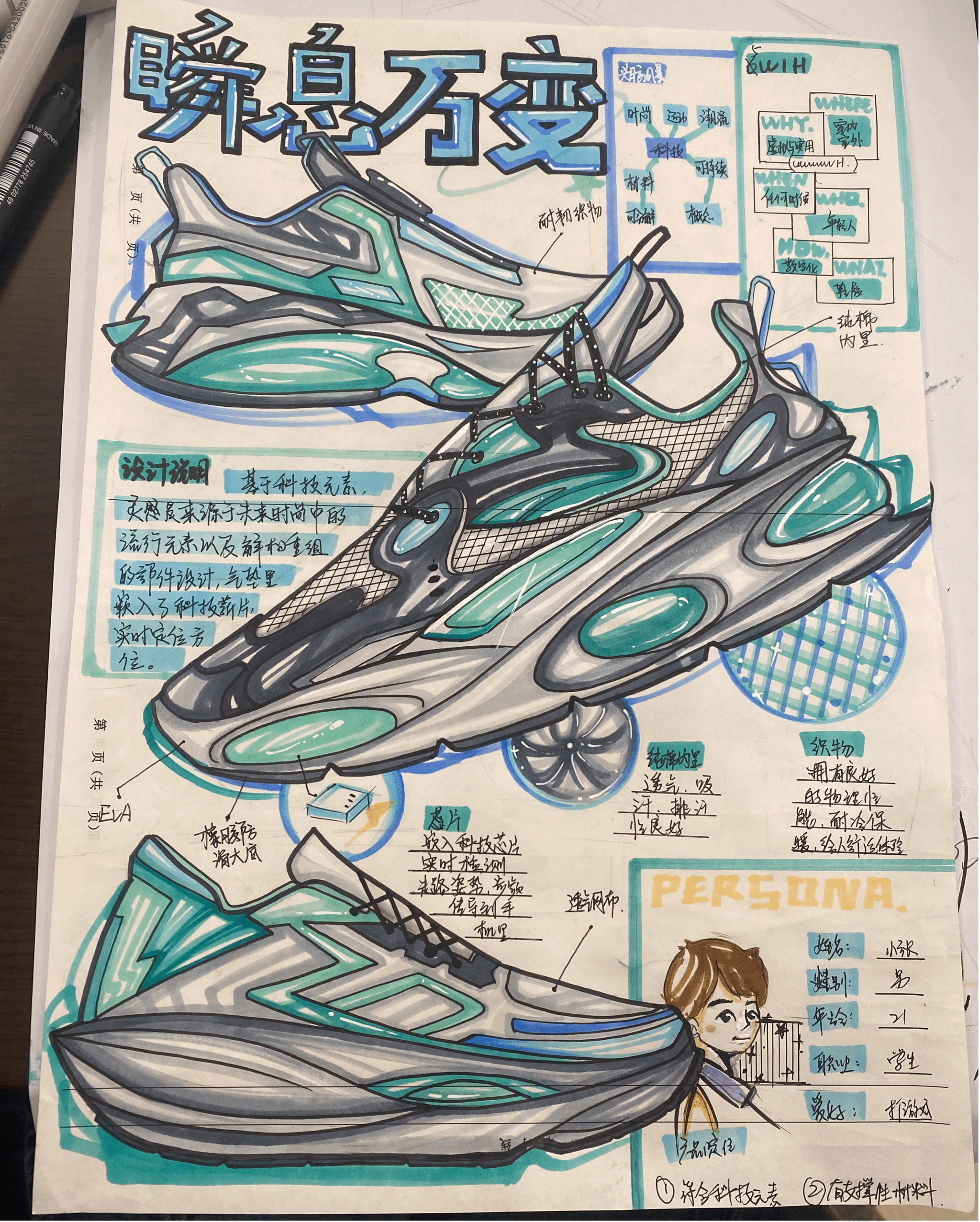 我从七月中下旬开始断断续续临摹鞋稿,暑假参加了线上集训。前期主要打基础、练造型,后来练快题版面:刚开始画一套要5、6个小时左右,在后期以量来训练自己的速度。手绘的主题主要围绕也围绕可持续、非物质、传统文化、科技这些方向定初稿,鞋子造型固定1-3款,材料分析、用户分析、头脑风暴等部分准备好固定的素材。在考前两周几乎两天画一张,练到最后2小时40分钟就能画完。